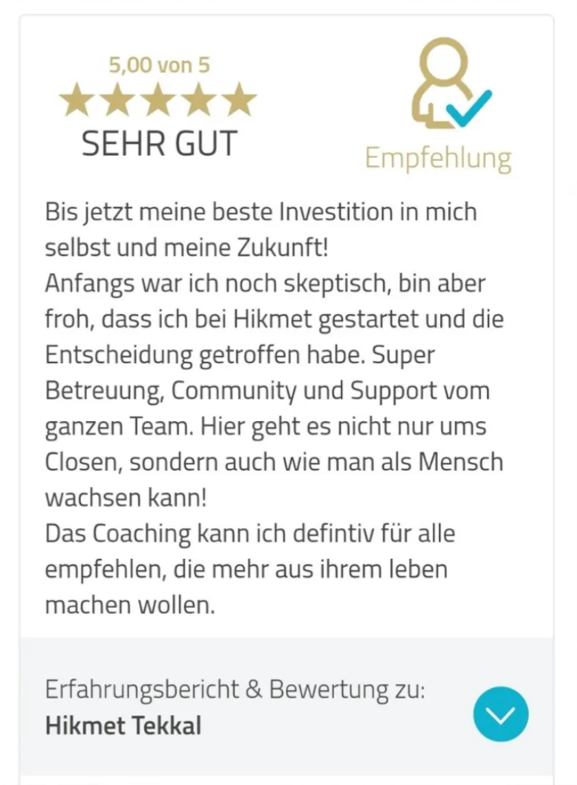 Mit unserem Fahrplan, Hikmets Begleitung und Unterstützung lernte sie, wie sie ihre Energie in das richtige Modell steckt. Schon nach wenigen Wochen führte sie ihre ersten Closer-Gespräche und baute sich ein zusätzliches Einkommen auf, das ihre Nebenjobs überflüssig machte.
